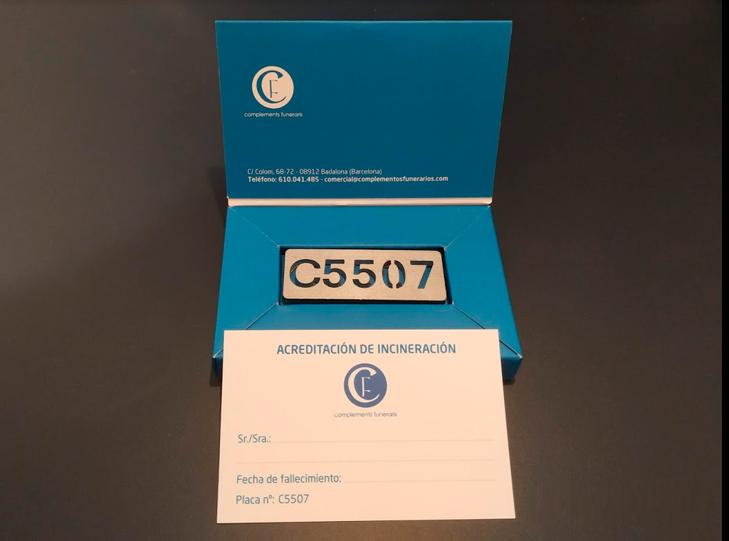 Hechas de un material resistente a altas temperaturas, contiene cinco dígitos alfanuméricos que podemos personalizar según sus preferencias y se colocan junto al ataúd en presencia de los familiares (si así lo desean).